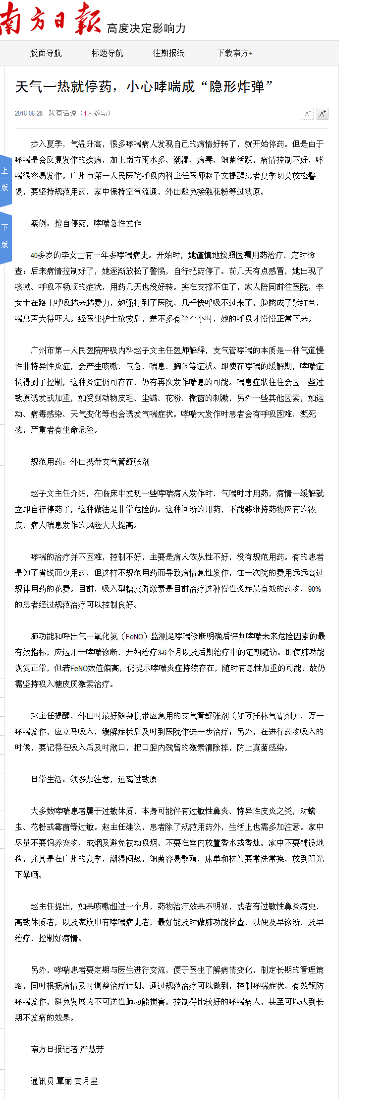 《南方日报》:天气一热就停药,小心哮喘成“隐形炸弹” 2016年6月28日B03版
