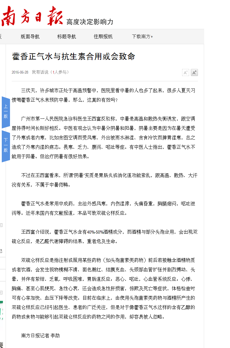 《南方日报》:藿香正气水与抗生素合用或会致命 2016年6月28日B03版