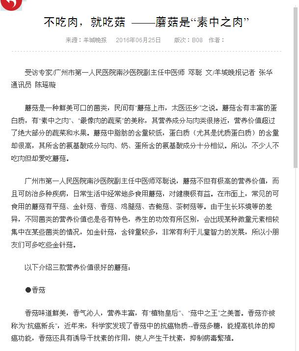 《羊城晚报》:不吃肉,就吃菇——蘑菇是“素中之肉” 2016年6月25日B8版