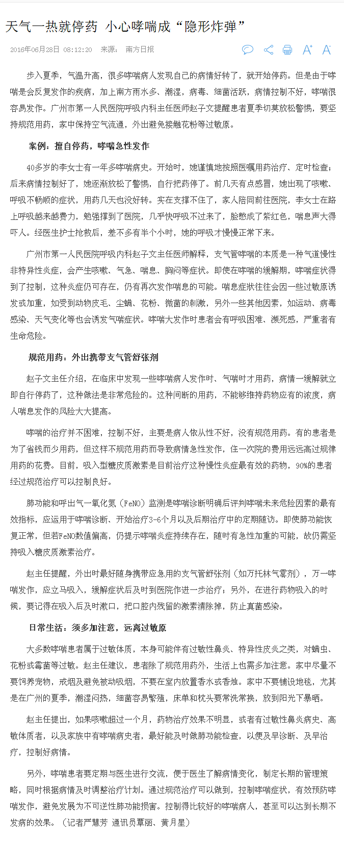 《南方日报》:天气一热就停药 小心哮喘成“隐形炸弹” 2016年6月28日