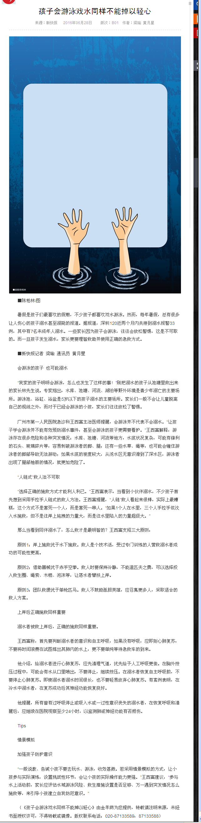 《新快报》:孩子会游泳戏水同样不能掉以轻心 2016年6月28日B01版