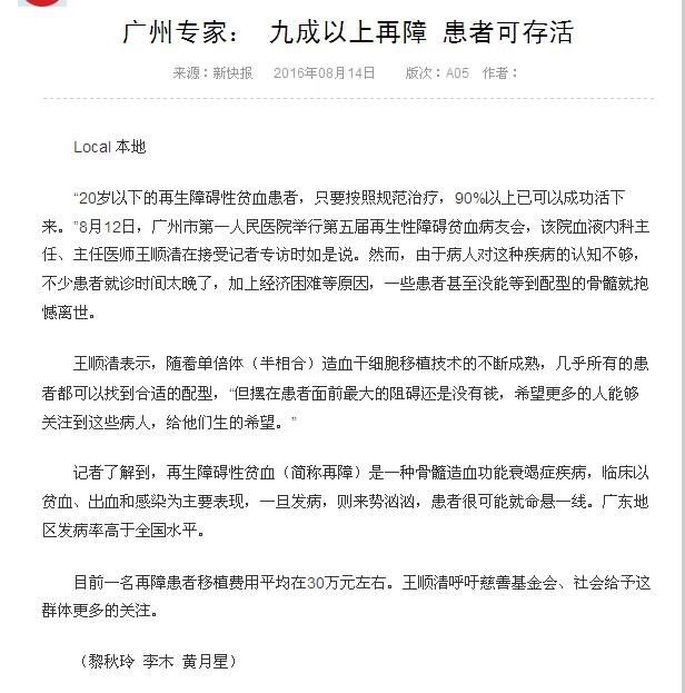 《新快报》:广州专家:九成以上再障 患者可存活 2016年8月14日A05版