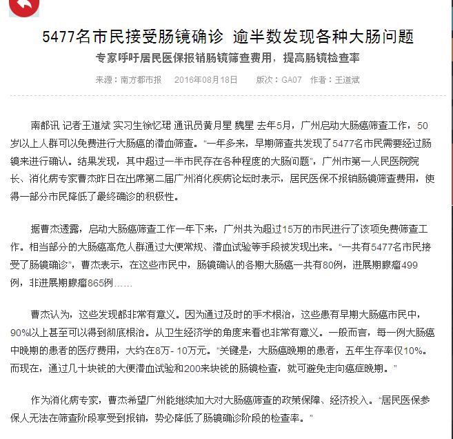 《南方都市报》:5477名市民接受肠镜确诊 逾半数发现各种大肠问题 2016年8月18日GA07版