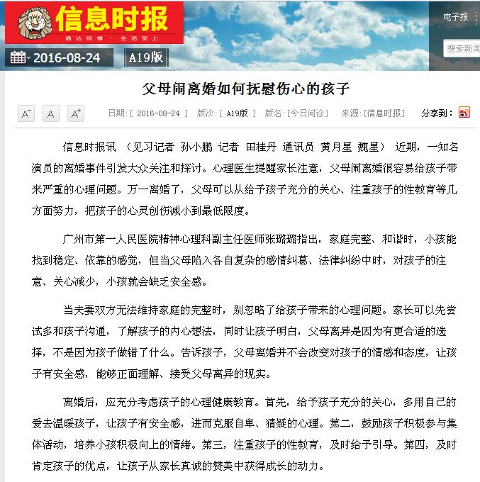 《信息时报》:父母闹离婚如何抚慰伤心的孩子 2016年8月24日A19版