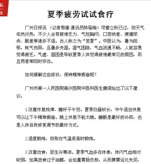 《广州日报》:夏季疲劳试试食疗 2016年8月10日B4版