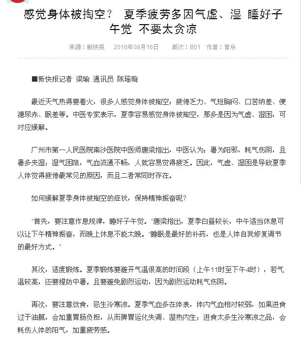 《新快报》:感觉身体被掏空?夏季多因气虚、湿 2016年8月16日B01版