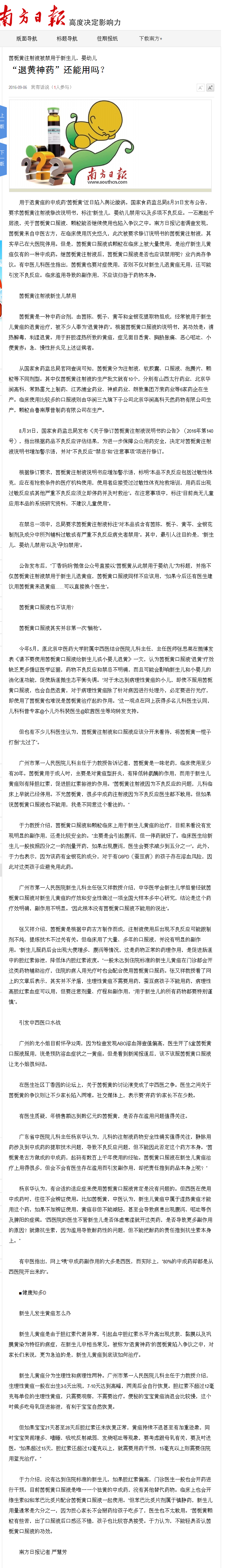 《南方日报》:“退黄神药”还能用吗? 2016年9月6日B01版