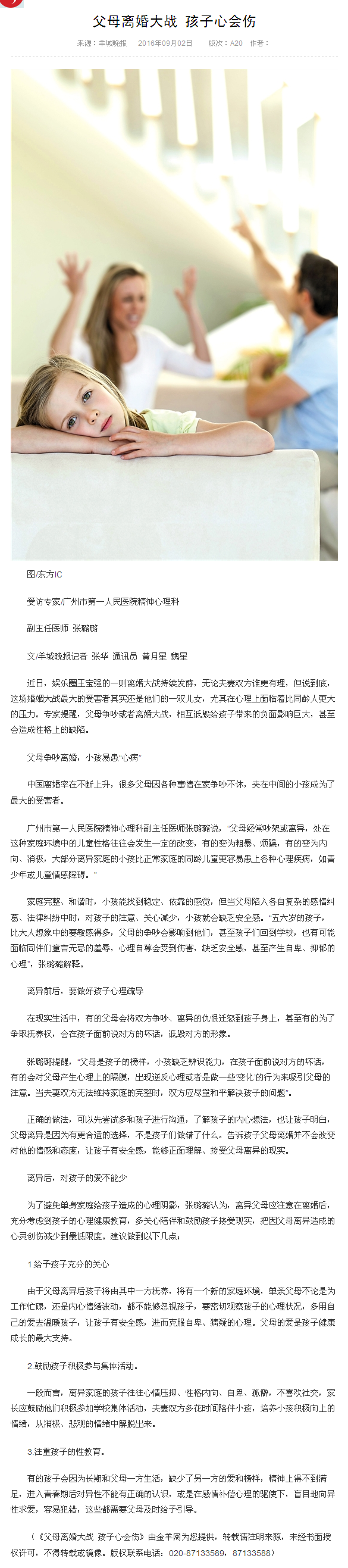 《羊城晚报》:父母离婚大战 孩子心会伤 2016年9月2日A20版