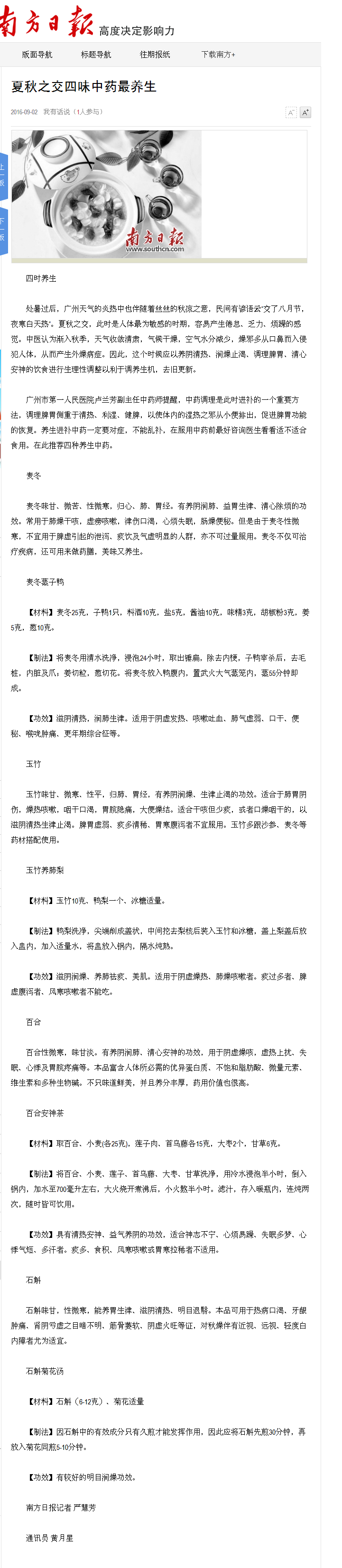 《南方日报》:夏秋之交四味中药最养生 2016年9月2日A25版