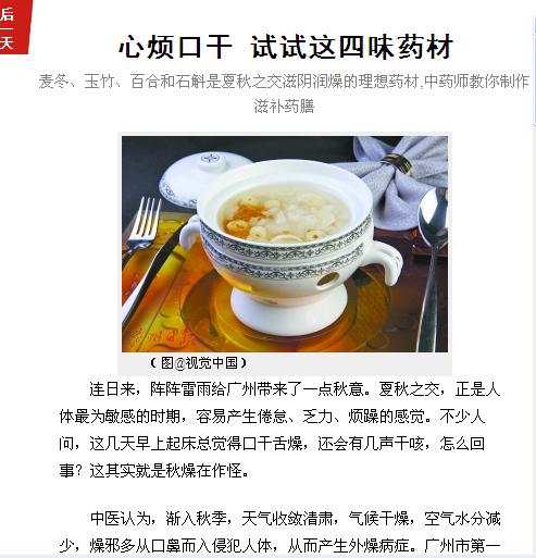 《广州日报》:心烦口干 试试这四味药材 2016年9月6日A22版