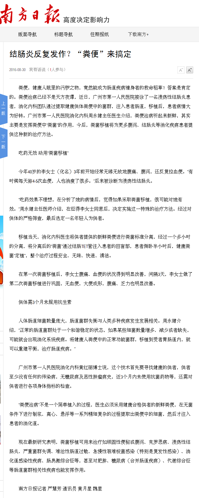 《南方日报》:结肠炎反复发作?“粪便”来搞定 2016年8月30日B03版