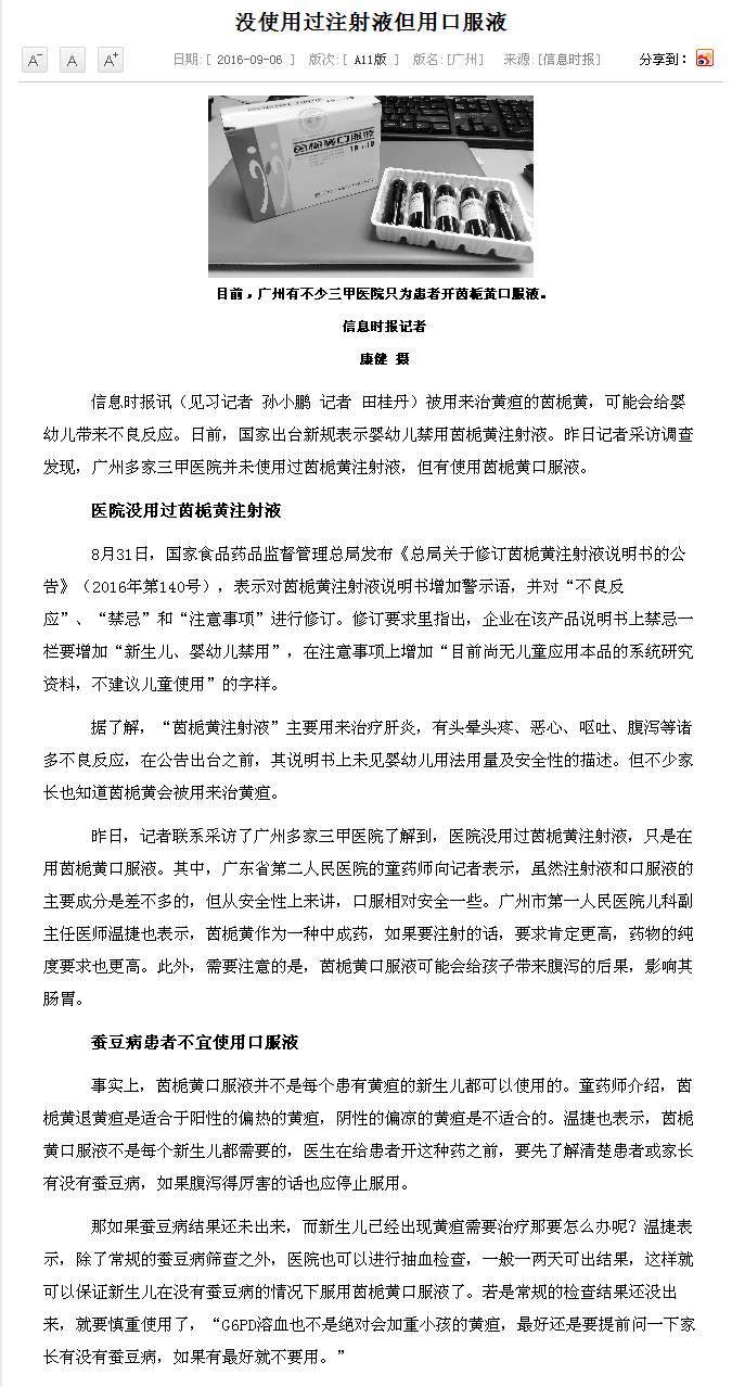 《信息时报》:没使用过注射液但用口服液 2016年9月11日A6版