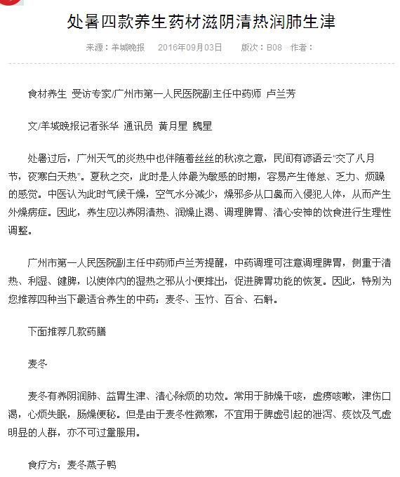 《羊城晚报》:处暑四款养生药材滋阴清热润肺生津 2016年9月3日B8版