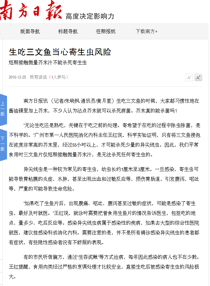 《南方日报》:生吃三文鱼当心寄生虫风险 2016年12月25日A05版