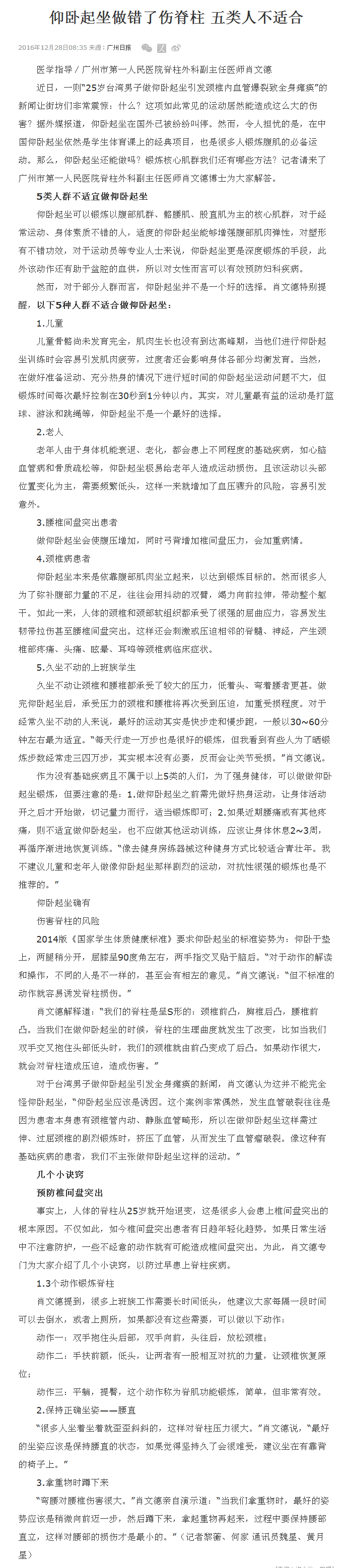 《广州日报》:仰卧起坐做错了伤脊柱 2016年12月28日B4版