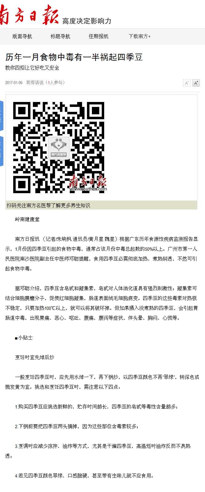 《南方日报》:历年一月食物中毒有一半祸起四季豆 2017年1月6日A09版