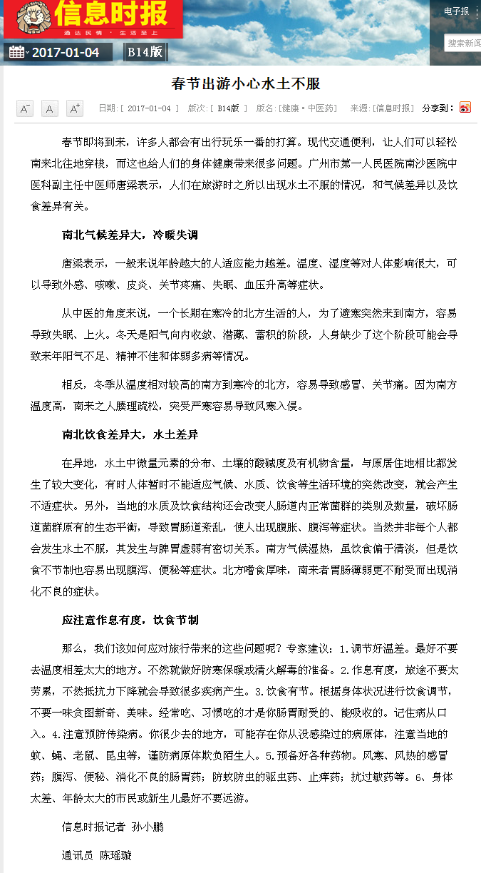 《信息时报》:春节出游小心水土不服 2017年1月4日B14版
