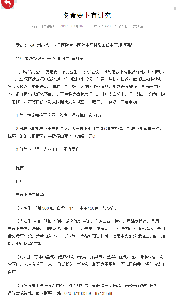 《羊城晚报》:冬食萝卜有讲究 2017年1月6日A20版
