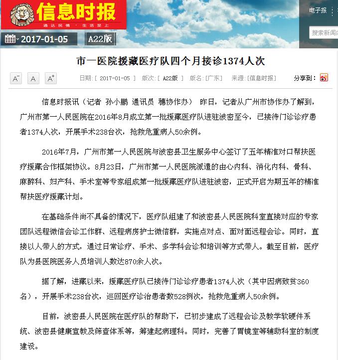 《信息时报》:市一医院援藏医疗队四个月接诊1374人次 2017年1月5日A22版