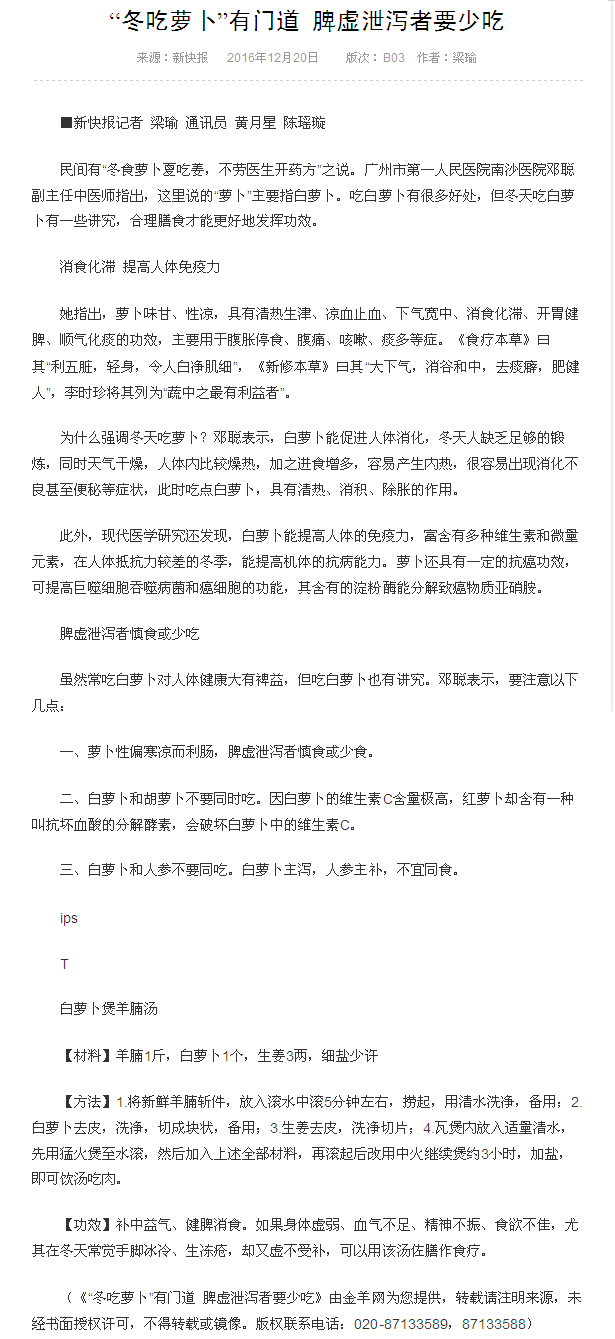 《新快报》:“冬吃萝卜”有门道 脾虚泄泻者要少吃 2016年12月20日B03版