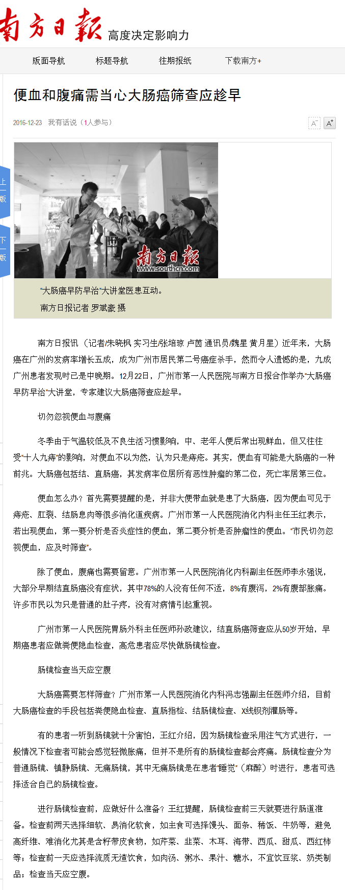 《南方日报》:便血和腹痛需当心 大肠癌筛查应趁早 2016年12月23日A13版