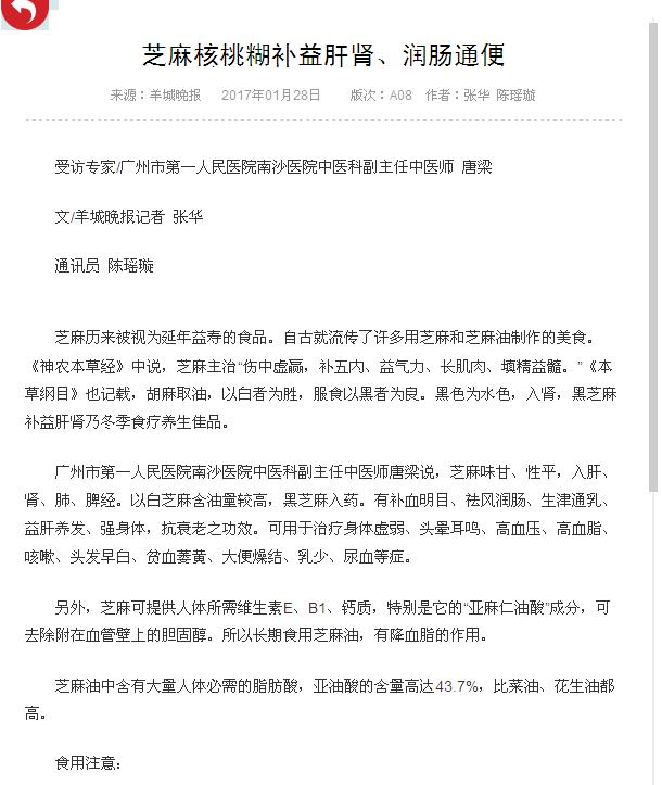 《羊城晚报》:芝麻核桃糊补益肝肾、润肠通便 2017年1月28日A8版