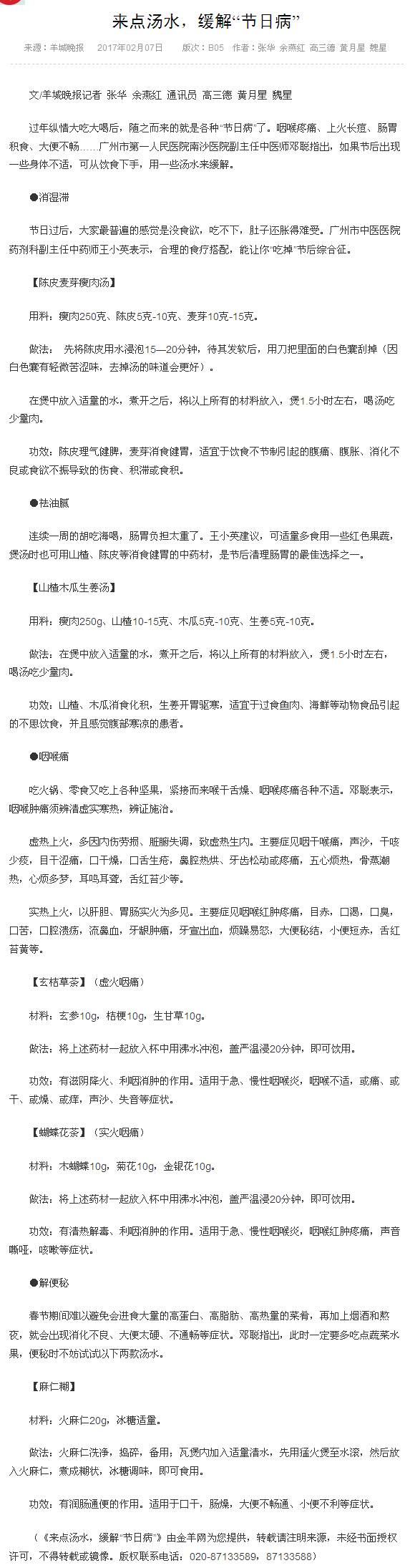 《羊城晚报》:来点汤水,缓解“节日病” 2017年2月7日B5版