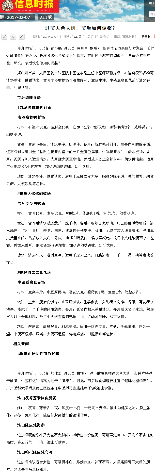 《信息时报》:过节大鱼大肉,节后如何调整? 2017年2月7日A11版