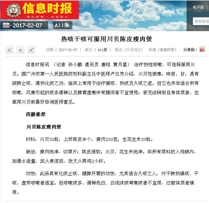 《信息时报》:热咳干咳可服用川贝陈皮瘦肉粥 2017年2月7日A11版