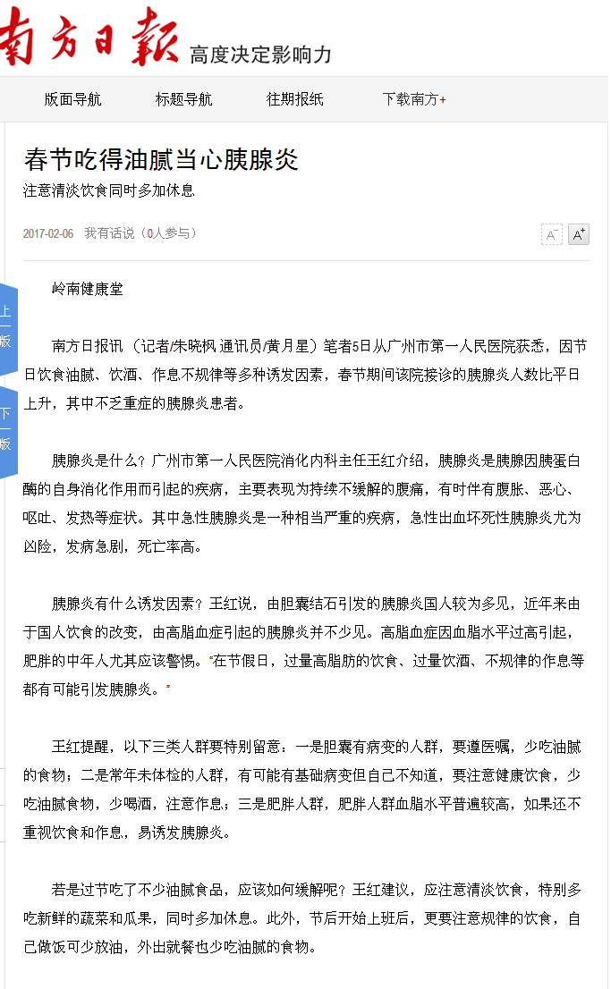 《南方日报》:春节吃得油腻当心胰腺炎 2017年2月6日A4版