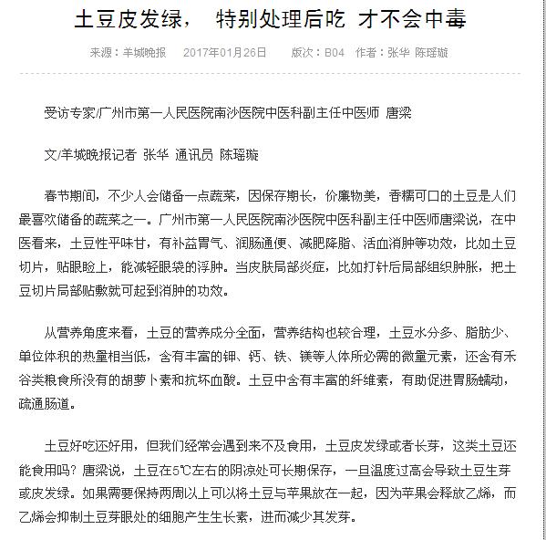 《羊城晚报》:土豆皮发绿,特别处理后吃 才不会中毒 2017年1月26日B04