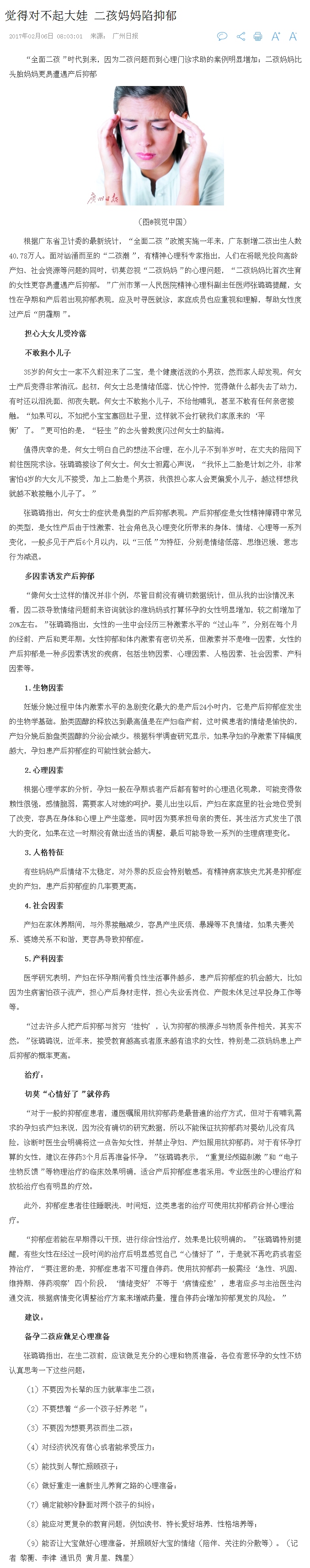 《广州日报》:觉得对不起大娃 二孩妈妈陷抑郁 2017年2月6日A13版