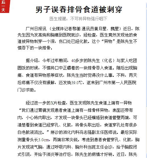 《广州日报》:男子误吞排骨食道被刺穿 2017年2月12日A3版