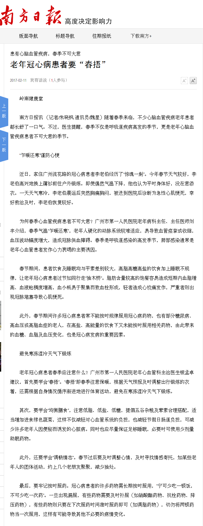 《南方日报》:老年冠心病患者要“春捂” 2017年2月11日A4版