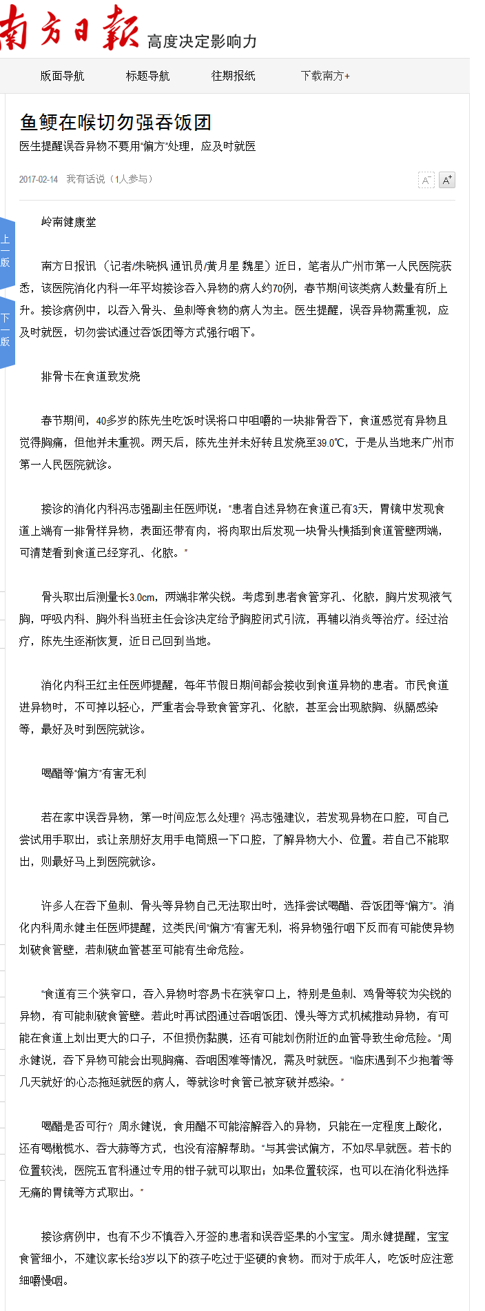 《南方日报》:鱼梗在喉切勿强吞饭团 2017年2月14日A07版