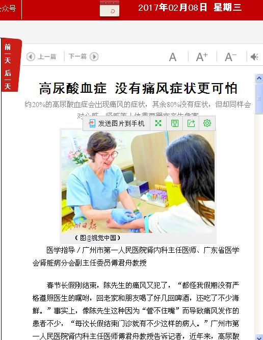 《广州日报》:高尿酸血症 没有痛风症状更可怕 2017年2月8日A17版