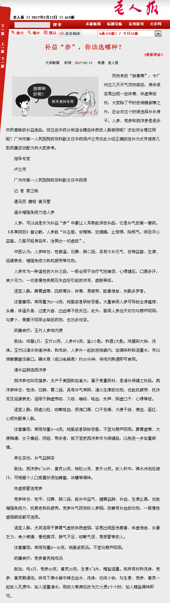 《老人报》:补益“参”,你该选哪种? 2017年12月13日A10版