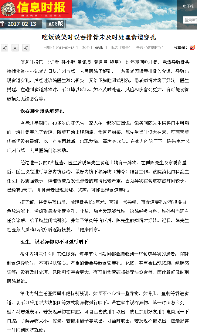 《信息时报》:吃饭谈笑时误吞排骨未及时处理食道穿孔 2017年2月13日A8版
