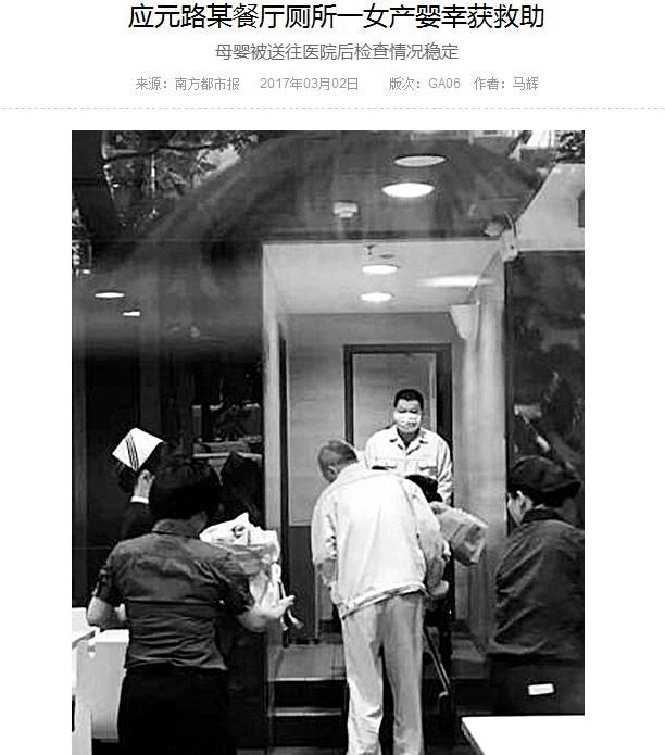 《南方都市报》:应元路某餐厅厕所一女产婴幸获救助 2017年3月2日GA06版