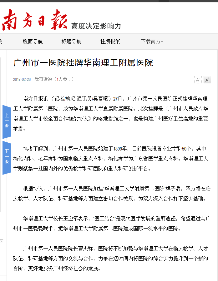 《南方日报》:广州市一医院挂牌华南理工附属医院 2017年2月28日GC02