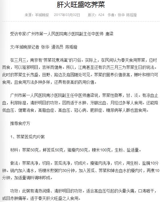 《羊城晚报》:肝火旺盛吃荠菜 2017年3月2日A24版