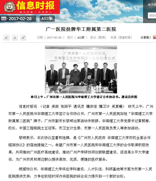 《信息时报》:市一医院挂牌华工附属第二医院 2017年2月28日A02版