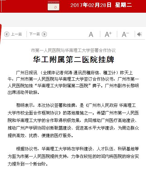 《广州日报》:华工附属第二医院挂牌 2017年2月28日A2版