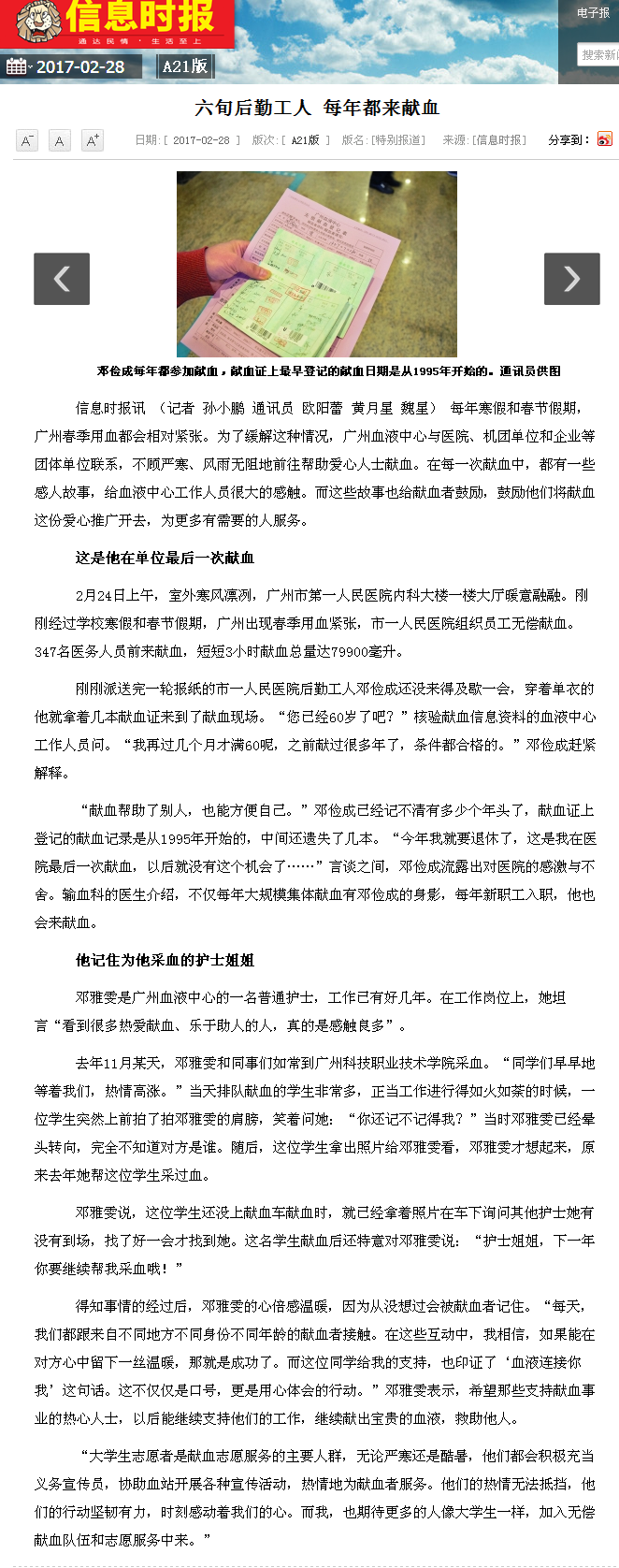 《信息时报》:六旬后勤工人 每年都来献血 2017年2月28日A21版