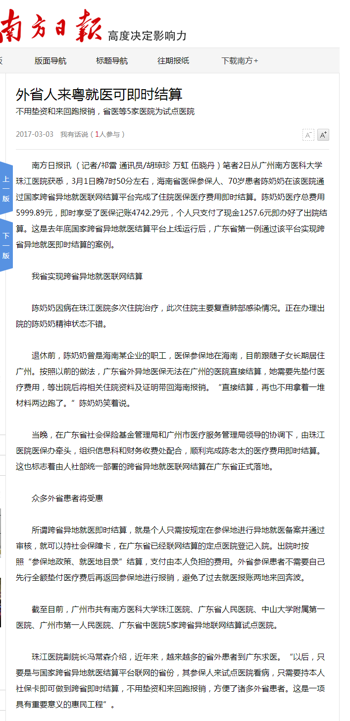 《南方日报》:外省人来粤就医可即时结算 2017年3月3日A11版