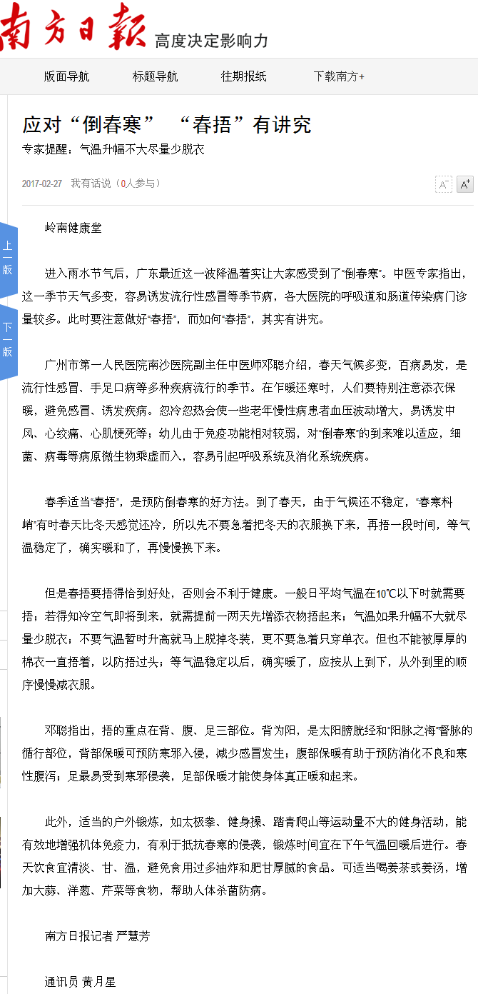 《南方日报》:应对“倒春寒”“春捂”有讲究 2017年2月27日A07版