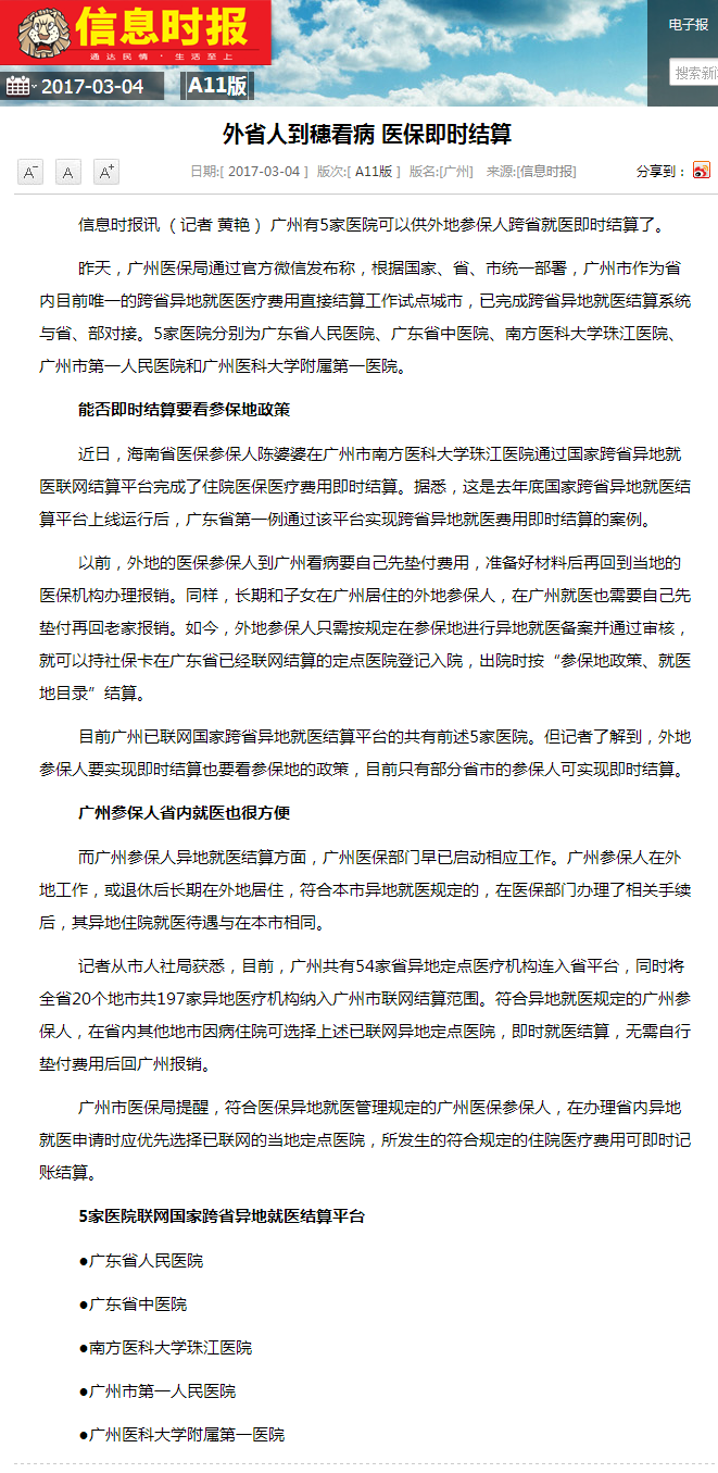《信息时报》:外省人到穗看病 医保即时结算 2017年3月4日A11版