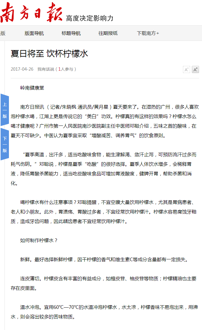 《南方日报》:夏日将至 饮杯柠檬水 2017年4月26日A08版