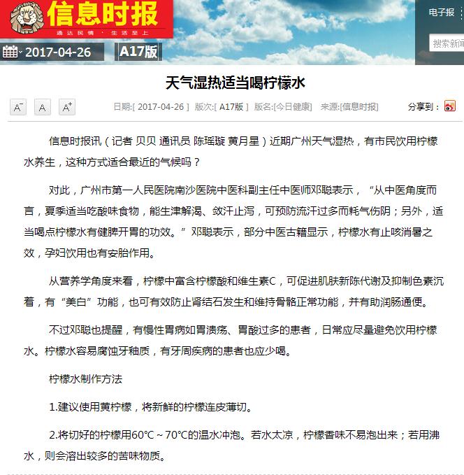 《信息时报》:天气湿热适当喝柠檬水 2017年4月26日A17版