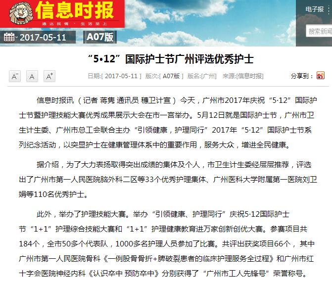 《信息时报》:“5·12”国际护士节广州评选优秀护士 2017年5月12日A07版